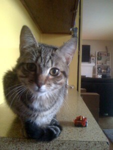 The vet insists on a name for him… I don’t want to name him I persist… Please don’t make me name him. I can’t keep him. I have a cat.  I have a very small house. Don’t make me name him…Well gosh don’t call him kitty, that’s dumb.  I don’t want to call him kitty.  Stop calling him kitty.